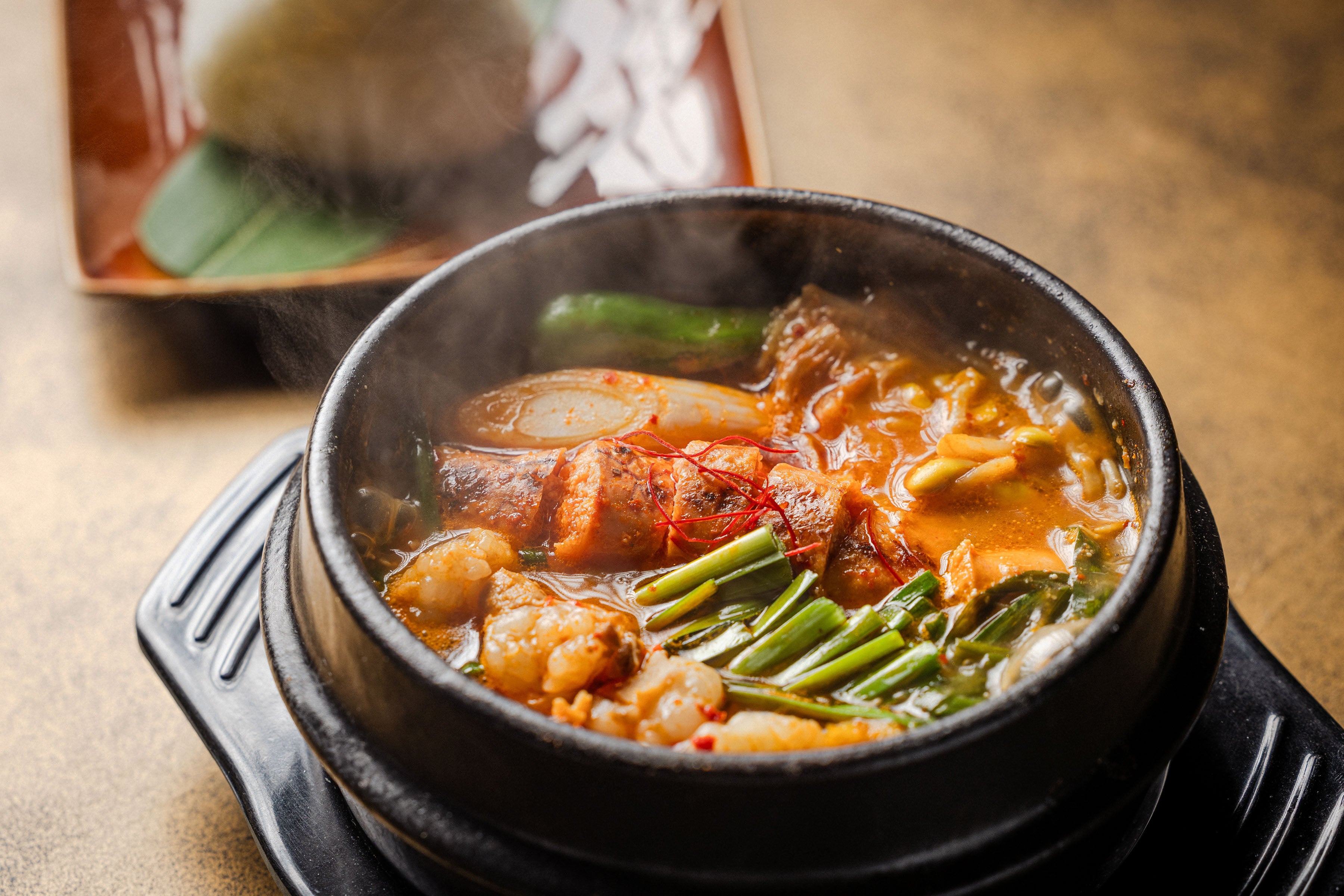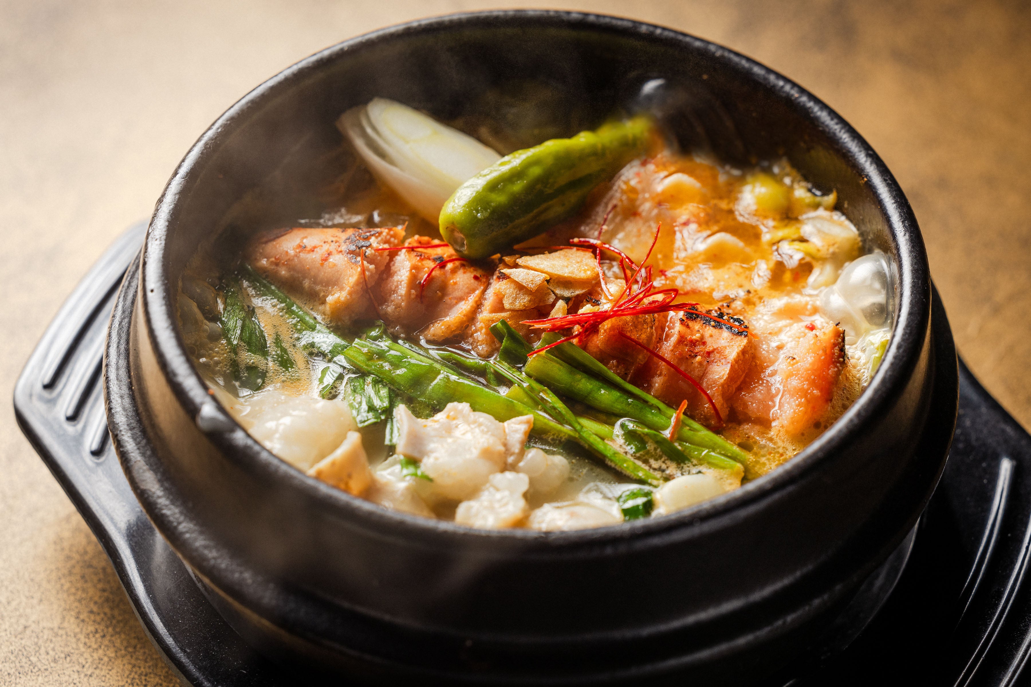 塩にんにく骨から抽出した贅沢でまろやかなコムタンスープに、和牛ホルモンの甘みが溶け込み、生にんにく・揚げにんにく・すりにんにくのトリプルパンチが効いた一品。