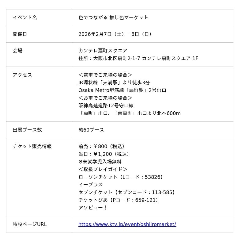 関西テレビ放送株式会社(代表取締役社長:岡 宏幸、以下、関西テレビ)は、GMOインターネットグループのGMOペパボ株式会社(代表取締役社長:佐藤 健太郎)が運営する国内最大(※1)のハンドメイドマーケット「minne(ミンネ) byGMOペパボ」(URL:https://minne.com/)と共同し、2026年2月7日(土)・8日(日)に大阪・カンテレ扇町スクエアで、推し色をテーマにしたイベント『色でつながる 推し色マーケット』(URL:https://www.ktv.jp/event/oshiiromarket/)を開催します。