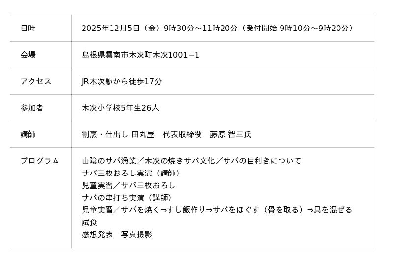 「日本さばける塾 in しまね」ではサバを題材に、雲南市木次町の郷土料理「焼きサバずし」を作ります。体験するのは、木次小学校5年生の児童26人です。児童たちは、講師を務める藤原智三氏(割烹・仕出し 田丸屋 代表取締役)にレクチャーを受け、自らサバを三枚おろしにおろします。大きなサバを丸ごとグリルで焼くのが木次の焼きサバですが、今回は家庭でも作りやすいように、サバを三枚におろし、フライパンで焼いて作ります。焼いた後に行う、飯切りですし飯と具を混ぜる作業や、講師によるサバの串打ちも見どころです。