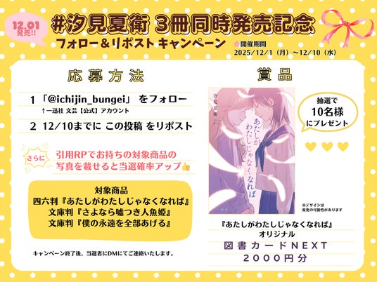 1⃣汐見夏衛 一迅社公式アカウント(@shiominatsue_ichijinsha)をフォロー