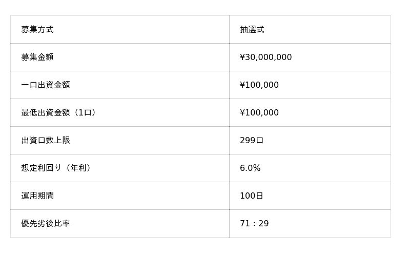本ファンドは【匿名組合型ファンド】で【抽選方式】にて募集。【1口10万円からのご出資】となります。