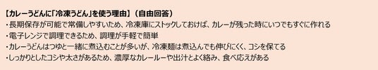 冷凍うどんを選んだ理由としては、「調理が簡単」「電子レンジで使える」「長期保存ができる」といった手軽さに加え、「麺にコシがある」「もちもちしていておいしい」「煮込んでも食感が崩れない」といった品質面の評価が多く挙がりました。