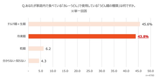 その結果、翌日の食べ方として「カレーうどん」が最も多く選ばれ、3指標(実際に食べている/経験がある/好き)すべてでトップとなりました。また、カレーうどんを作る際に使用する麺では「冷凍うどん」が(43.8%)となり、約半数の方が、家庭で作るカレーうどんの麺として、冷凍うどんを選んでいることが明らかになりました。