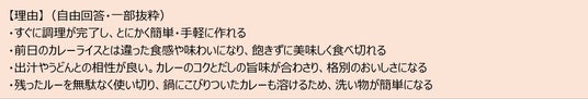 こうした結果から、カレーライスは単なる一食のメニューではなく、翌日の食卓までを見据えて作られる料理であることがうかがえます。