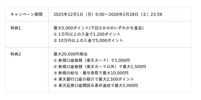 楽天銀行株式会社(本社:東京都港区、代表取締役社長:東林 知隆、以下「楽天銀行」)は、個人のお客さまを対象に、本日、2025年12月1日(月)から2026年2月28日(土)までの期間限定で、口座開設やサービスのご利用に対して楽天銀行として特典進呈額が過去最大となる「過去最強の特典祭」を開催します。