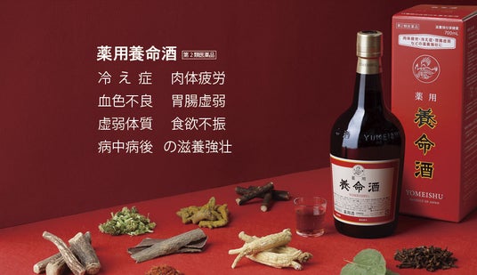 薬用養命酒は14種類の生薬が溶け込む第2類医薬品です。ご服用いただきますとお腹のなかからじわ~っと温まります。その薬効成分は、血行に伴われて全身を巡り、代謝を活発にしながら、滋養強壮剤として、冷え症、肉体疲労、胃腸虚弱、食欲不振、虚弱体質、血色不良、病中病後といった症状を改善します。