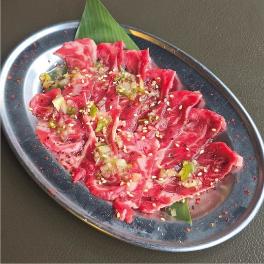 ニューたけ田の名物としてもう一つ欠かせないのが、料理長の渾身の一皿 「上ハラミてっさ 3秒焼き」。一度も冷凍していない塊の上ハラミを店舗で「てっさのように薄切り」にし、片面3秒だけさっと炙り、特製青唐だれで食べるスタイル。