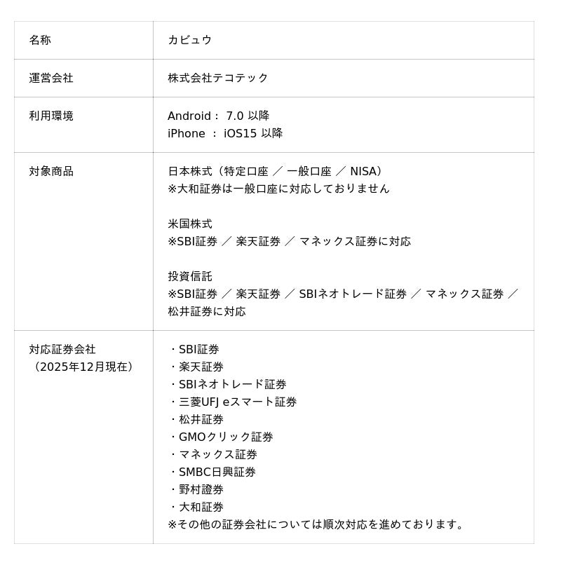 株式会社テコテック(本社:東京都渋谷区、代表取締役:釣崎宏)は、2025年12月2日(火)より、株式投資 管理・分析アプリ『カビュウ』において、「ウォッチ銘柄」「ポートフォリオ」など 大型アップデートを実施しました。