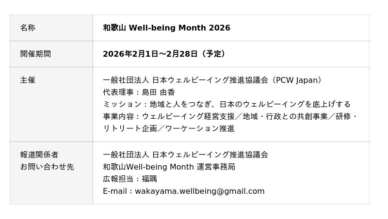 2026年も各地でのイベントや体験プログラムを通じて、和歌山の魅力を再発見し、「ウェルビーイングがアガる2月」を地域や参加者の皆さまと共に創ってまいります。