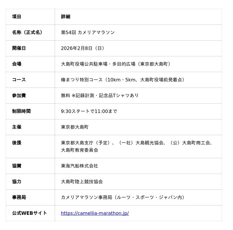 東京都にある離島・伊豆大島にて、島最大のお祭りである「椿まつり」の期間中に、誰でも気軽に参加できるファンランイベント「第54回カメリアマラソン」が開催されます。主催は大島町(東京都)で、開催日は2026年2月8日(日)です。