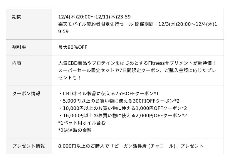英国発CBD専門店Naturecanは、12/4(木)20:00~12/11(木)23:59まで開催される楽天スーパーSALEにおいて、品質にこだわった高濃度「40%CBDオイル」や、まるでジュースのような飲み心地が大人気の「クリアホエイプロテインアイソレート」をはじめとする数多くの商品を、最大80%OFFにて販売致します。楽天モバイル契約者限定先行セール 開催期間:12/3(水)20:00~12/4(木)19:59