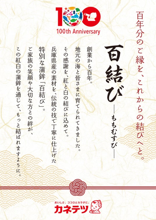 「百年分のご縁を、これからの結びへと。」蒲鉾発祥の地(神戸)発、まもなく創業100年を迎えるカネテツデリカフーズから、老舗が育むこだわり製法と兵庫の素材で結ぶ「特別なお正月蒲鉾"百結び"」が新発売!