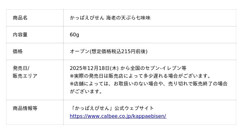 カルビー株式会社(本社:東京都千代田区、代表取締役社長兼CEO:江原 信)は、"やめられない、とまらない♪"でおなじみの「かっぱえびせん」より、年末年始に向けた新商品『かっぱえびせん 海老の天ぷら七味味』を2025年12月18日(木)から順次、全国のセブン-イレブン等の店舗限定で数量限定発売します。(なくなり次第終了)