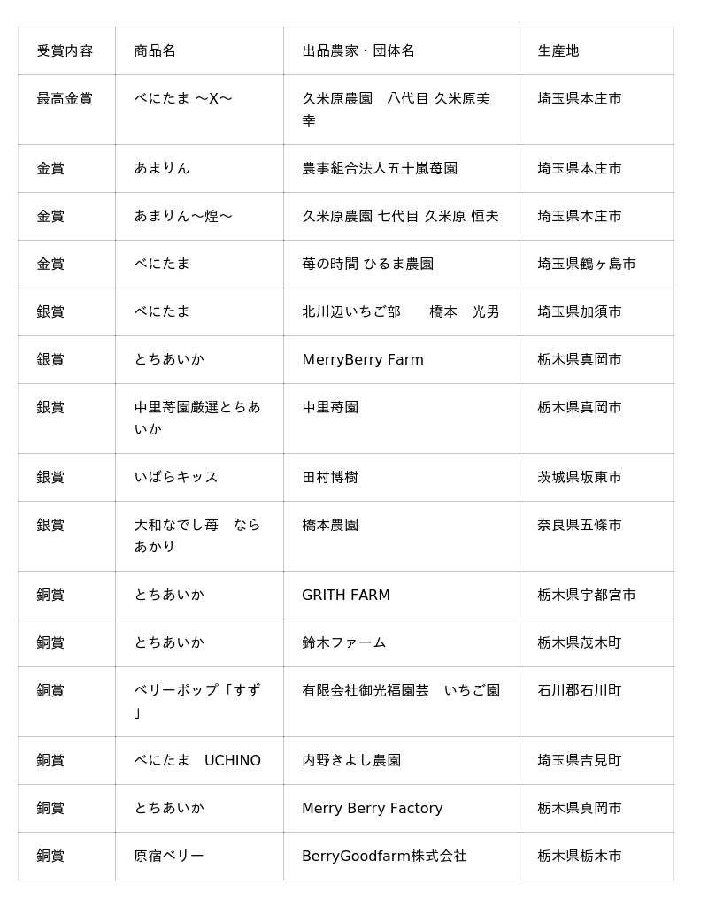 そのおいしさを審査し、評価員全員の合計点数によって各賞を決定しました。審査の結果、「第3回クリスマスいちご選手権」の最高金賞には、埼玉県本庄市の『べにたま -X-』(久米原農園 8代目 美幸)が輝きました。埼玉県産のいちごが3年連続で最高金賞を受賞する中、栃木県産とちあいか、茨城県産いばらキッス、奈良県産ならあかり、福島県産ベリーポップすずが上位に選ばれました。