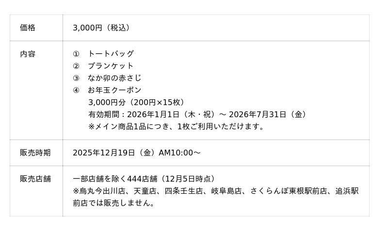 「なか卯の福袋」は、落ち着いた風合いで大容量のトートバッグとなか卯の"こだわり卵"をモチーフにしたデザインのふわふわのブランケット、店舗でも使用されている赤さじ、そして、すべてのメイン商品にご利用いただける3,000円分のクーポンが入ったお得な商品です。