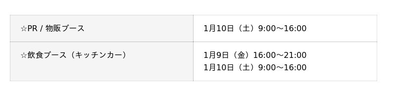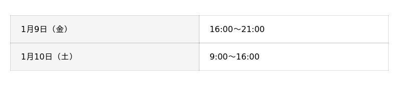 営業時間:1月9日(金)16:00~21:00 / 1月10日(土)9:00~16:00