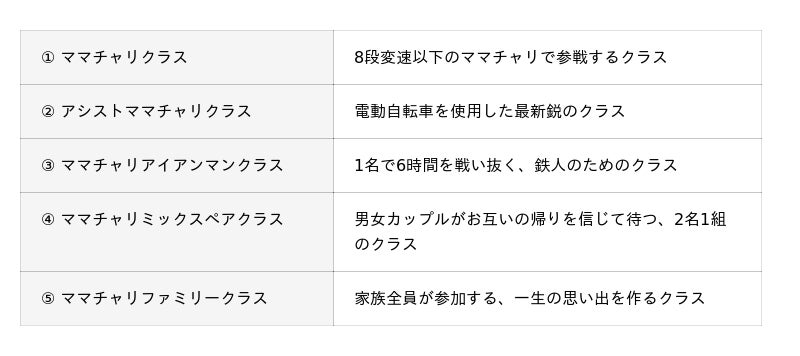 新たに新クラスも設置され、1名で6時間を戦い抜くクラスや男女カップル2 名参戦のクラス、その他は3 名以上10 名以下(お子様が走行する際には、この人数に含まれる)でチームを組んで、参加していただくことが可能です。お子さまやご家族はもちろん、学生や会社の仲間や友人みんなでママチャリでのサーキット走行を楽しみましょう!