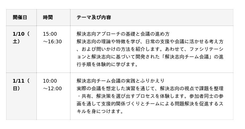 日 時:2026年1月10日(土)15:00~16:30、2026年1月11日(日)10:00~12:00※1日のみの参加も可能ですが、受講証明書は両日受講いただいた方の内、希望者に交付します。
