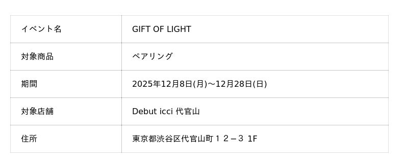 Debut icci 代官山は、2025年12月8日(月)より、ホリデーシーズンに向けた特別なペアリング制作プラン「GIFT OF LIGHT」を開催いたします。