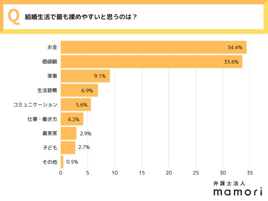 TOP3 1.お金:34.4% 2.価値観:33.6% 3.家事:9.1%
