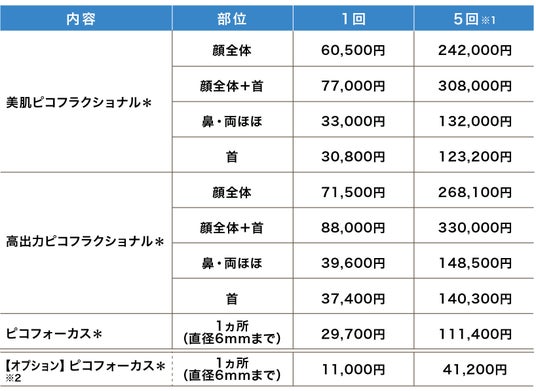 ※2 美肌ピコフラクショナルまたは高出力ピコフラクショナルと同日に施術する場合の併用限定価格。