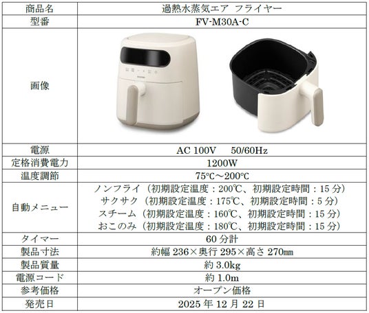アイリスオーヤマ株式会社(本社:宮城県仙台市、代表取締役社長:大山 晃弘)は、当社独自の「スチームモード」により揚げ物、焼き物の調理をよりジューシーに仕上げる「過熱水蒸気エア フライヤー」を2025年12月22日よりインターネットサイトや全国の家電量販店を中心に順次(※1)発売します。