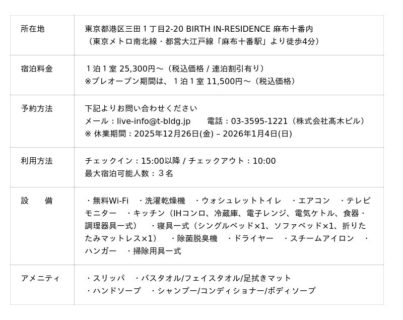 オフィスビル・レジデンス・コワーキングスペース等を都内に展開し、不動産の新しい価値を生む"場所・まちづくり"につながる企画・運営を行う株式会社高木ビル(本社:東京都港区西新橋 代表取締役:高木秀邦 ※「高」は「はしごだか」が正式表記)は、新規事業として「BIRTH STAY(バース・ステイ)」を始動いたします。第一弾として、同社が展開する"住むオフィス × 働く住まい"をテーマとした複合型レジデンス「BIRTH IN-RESIDENCE 麻布十番」内の1室を宿泊施設としてプレオープン。2025年12月に試験運用を開始し、2026年2月1日(日)より本格スタートする予定です。