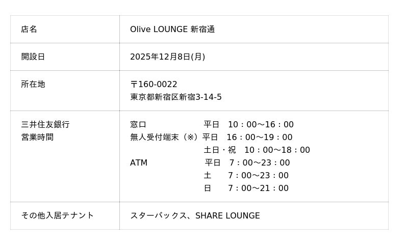 株式会社三井住友銀行(頭取 CEO:福留 朗裕、以下「三井住友銀行」)が、三井住友銀行と三井住友カードの共同商品「Olive(オリーブ)」をモチーフとした新しいコンセプトの店舗「Olive LOUNGE(オリーブ ラウンジ)新宿通」を12月8日に開設いたしました。銀行とスターバックス、SHARE LOUNGE(シェアラウンジ)が一体になったOlive LOUNGE 10号店としてオープンし、新宿に行き交う多様な人が心地よく過ごせる場を目指します。