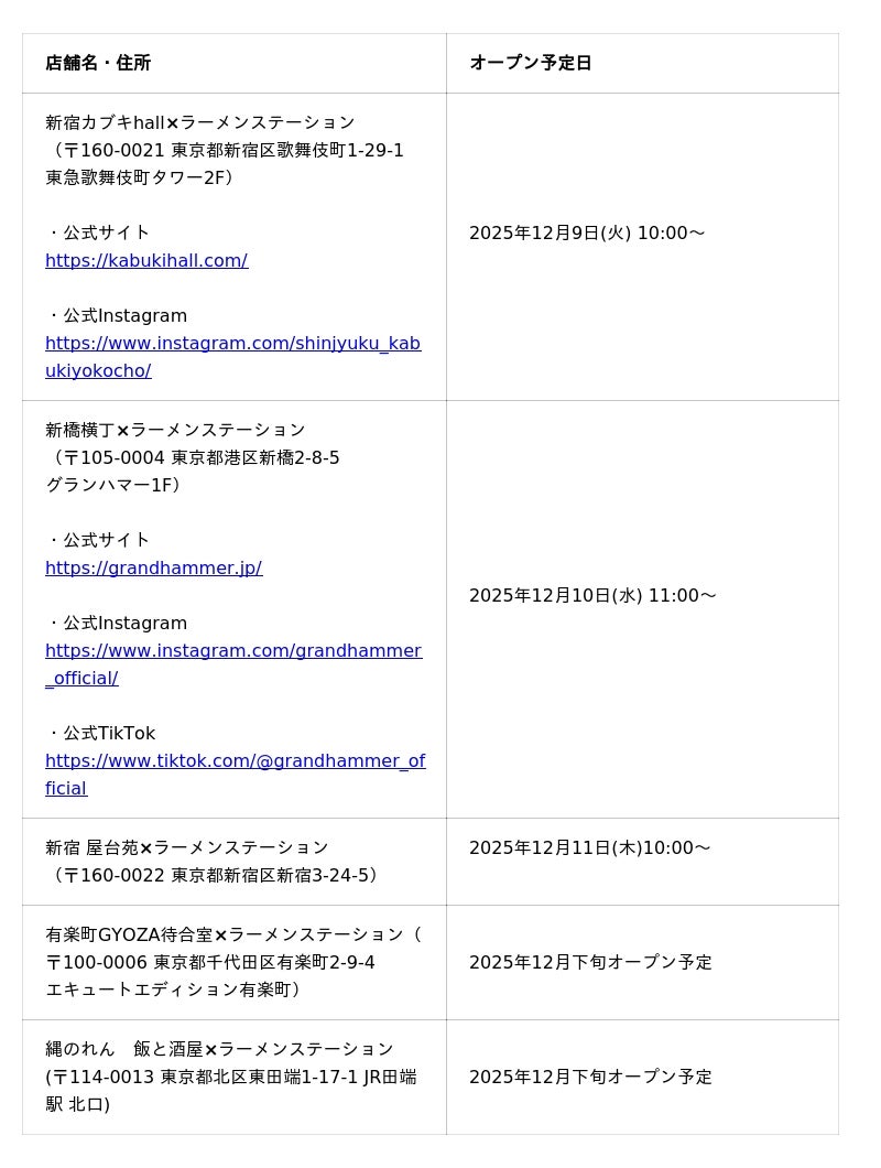 株式会社浜倉的商店製作所(本社・東京都中央区、代表取締役 浜倉好宣、以下「当社」)は、株式会社IOBI (本社・大阪府大阪市、代表取締役 石井智大)が手掛けるラーメンステーションとのコラボレーション店舗を2025年12月から東京圏で複数店オープンいたします。