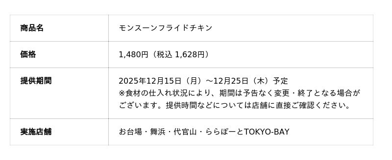 <モンスーンカフェ>12/15~「モンスーンフライドチキン」12/15より期間限定 提供開始!外はカリッと香ばしく、中は驚くほどジューシーに仕上げた、モンスーンカフェ特製のフライドチキンは、スパイスの芳醇な香りとチキンの濃厚な旨味が口いっぱいに広がる 寒い季節にぴったりのやみつきメニューです。