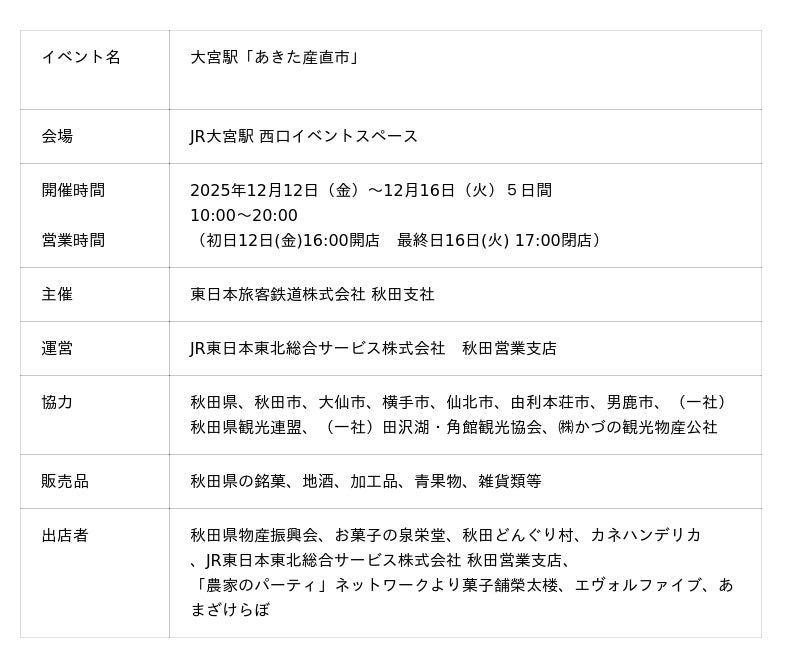 2025年12月12日(金)~16日(火)に秋田県の地産品販売や観光PRをします!秋田でしか買えない商品も多数ご用意!また13日(土)には列車荷物輸送サービス<はこビュン>を活用し秋田の旬をお届け!