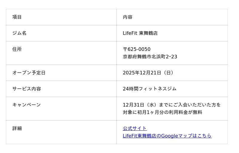 フィットネスジムLifeFit東舞鶴店が2025年12月21日(日)オープン!京都府舞鶴市でエリア最安の24時間快適ジムが誕生