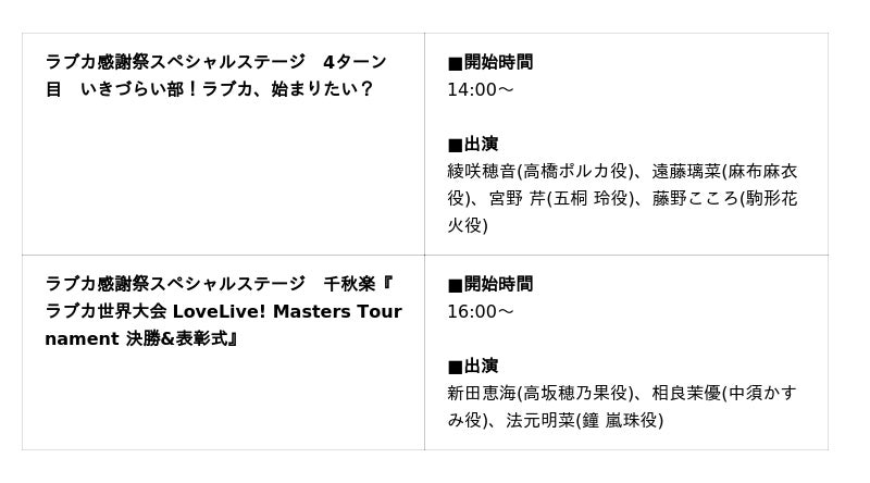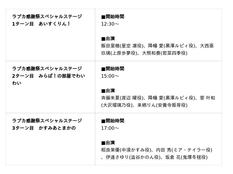 「ラブカ感謝祭」で実施するキャスト登壇ステージの詳細情報を解禁いたしました!イベント1日目のステージには、上原歩夢役 大西亜玖璃さんの追加出演も決定!