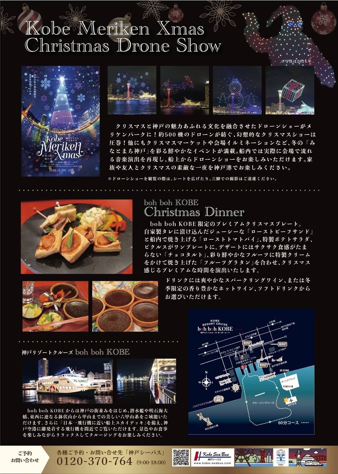 12月20日(土)~25日(木)(※23日は除く)、boh boh KOBE船上でクリスマスイベント『Christmas Night Cruise2025』を開催します!boh boh KOBEから歩いて10分のメリケンパークにも、クリスマスマーケット、イルミネーション、ドローンショーなどを楽しめる「Kobe Meriken Xmas - Christmas Drone Show」が開催!神戸港で特別なクリスマスを楽しみましょう♪