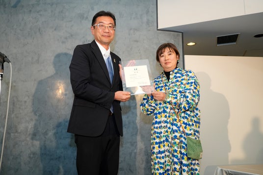 さらにメルシャン株式会社料飲ブランディング支社長・大家紳一郎氏からは、川内氏の名前が刻印されたマグナムサイズの「シャンパーニュ・グルエ ブリュット・セレクション」 が贈られ、加えてサプライズとして福島県産のブドウで造られたシャトー・メルシャン「新鶴シャルドネ」 も手渡されました。