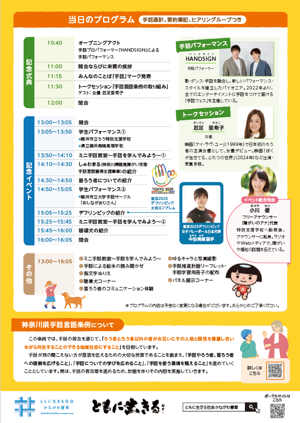 当日は、歌・ダンス・手話を融合した新しい表現方法を確立し、注目を浴びている HANDSIGN さん、映画「アイ・ラブ・ユー」で日本初のろう者主演女優となった忍足亜希子さんがス ペシャルゲストとして登場するほか、県からは首藤副知事が出席します!