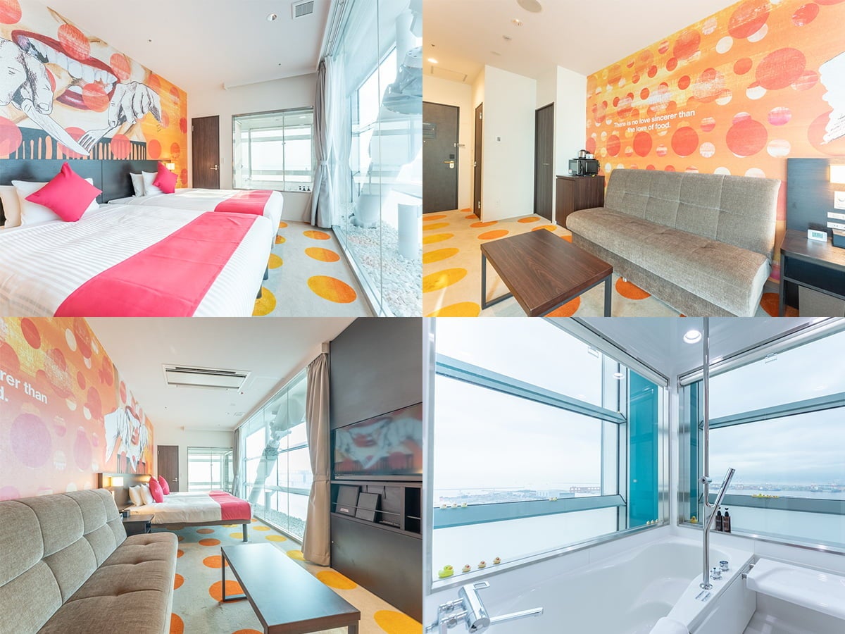 「世界から大阪へ 大阪から世界へ」をコンセプトに様々な趣向が凝らされたホテルは、国内外からのお客様に大阪観光を満喫いただけるよう、テーマパーク最寄り駅「ユニバーサルシティ駅」へのシャトルバスも運行。全ての客室が35平方メートル 以上あり最大6名まで宿泊可能で機能性とデザイン性を両立させた和洋室が中心。展望台から見える夜景は日本の夜景百選に選ばれたほどで、階数は違えど全ての客室から関西の夜景を一望できます。また、大阪を代表するアーティストや企業とのコラボレーションルームもお楽しみ頂けます。