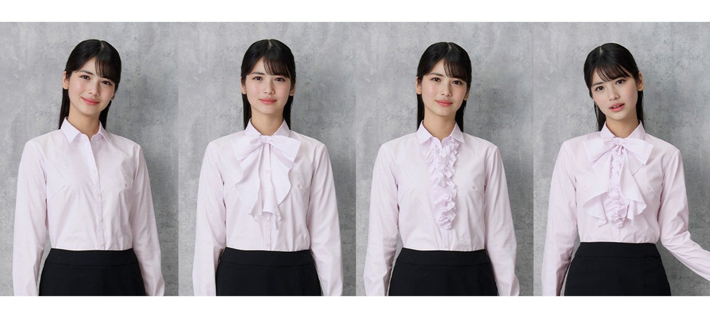本ブラウスの最大の特長は、取り外し可能なフリルとリボンにより、着用シーンや気分に合わせて4通りの着こなしが楽しめる点です。リボンは予め結び目が固定されているため、取り付けが簡単で身だしなみを整える手間を省くことが可能になります。