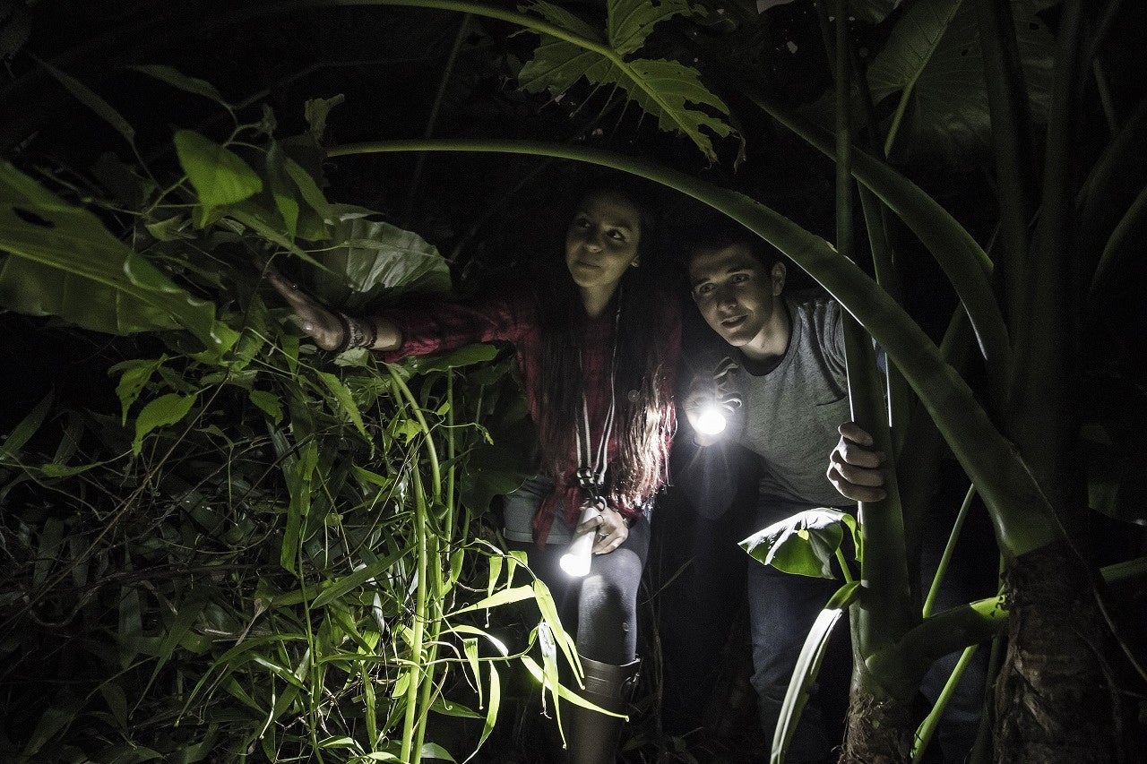 懐中電灯ひとつを頼りに、真っ暗なジャングルを歩くことで、視覚以外の感覚が研ぎ澄まされます。