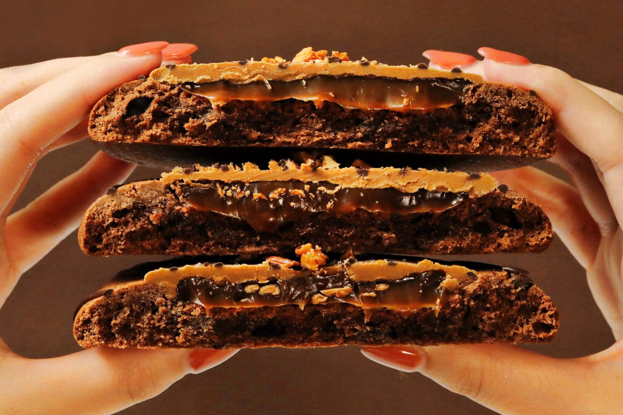 を重ねて、ザクザク食感のナッツをトッピングしました。チョコのやさしい甘みとキャラメ