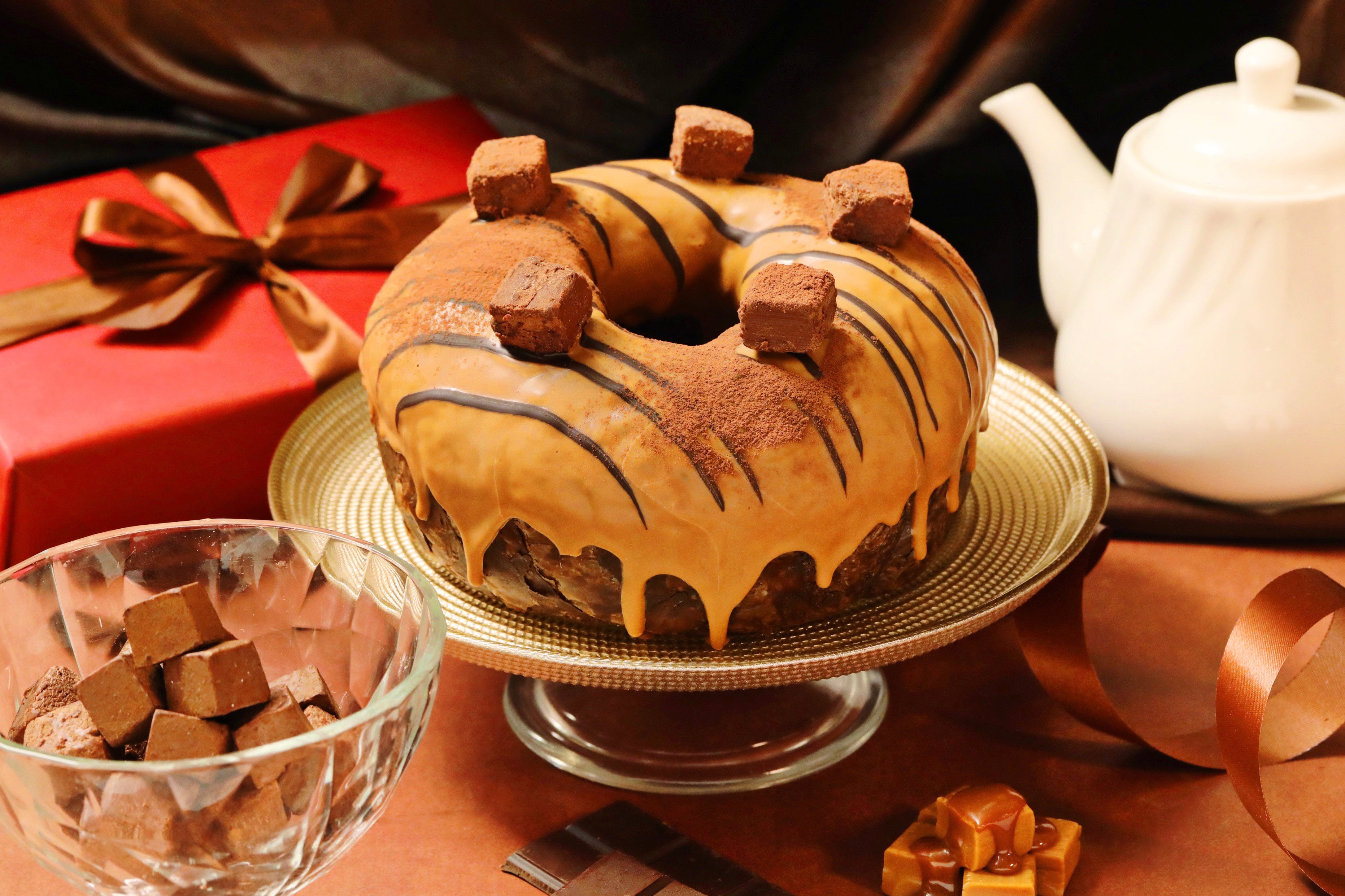 リームを包み、表面にキャラメル風味の上掛けチョコを重ねました。仕上げに口どけの良い
