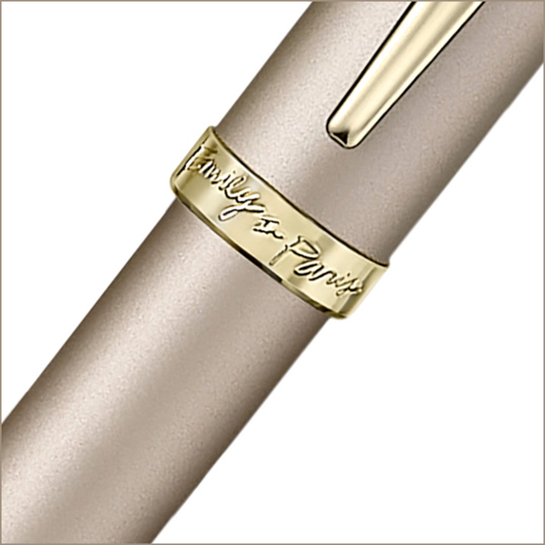 定番アイテムの「シェーファー100」が、輝くシャンパンゴールドトーンのラッカー仕上げとトリムをまとい、「シェ-ファー x エミリー・イン・パリス」モデルとしてドレスアップしました。毎日の筆記を贅沢なひとときへと変えるこのペンは、控えめなエレガンスとさりげなさが特徴。クリップには、エミリーを象徴するスタイルを称えるかのように、シグネチャーのリボン型のエンブレムが誇らしげにあしらわれ、ドラマタイトルとシェーファーがダブルネームで刻印されたリングが、このクラシックなシルエットにコレクターズアイテムとしての風格を添えています。さらに天冠にはエッフェル塔のモチーフがデザインされています。筆記スタイルは滑らかでバランスの取れた万年筆と、スムースなツイストアクションのボールペンから選択可能。ToDo リストからラブレターまで、あらゆる用途に書く喜びを添えます。