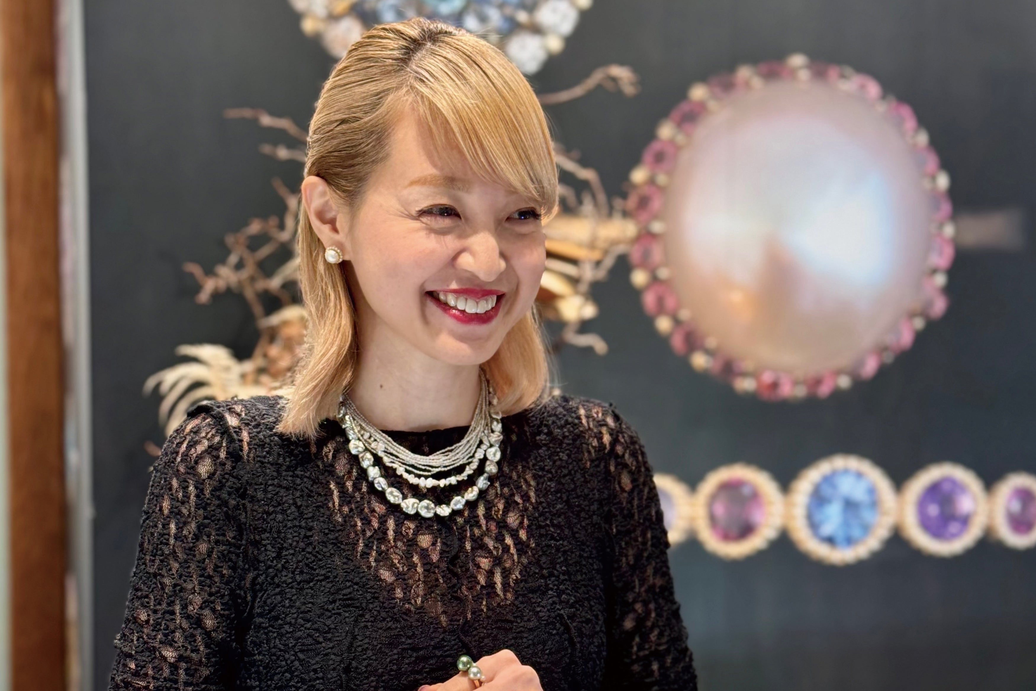 微細なグラデーションが印象的なサファイア、カーヴィングを施した大粒のトルマリン、眩い輝きをまとった大粒ダイヤモンド、黒・パープル・オレンジがかった干渉色が美しい真珠など、季節感のあるコーディネートを彩るジュエリーたち。