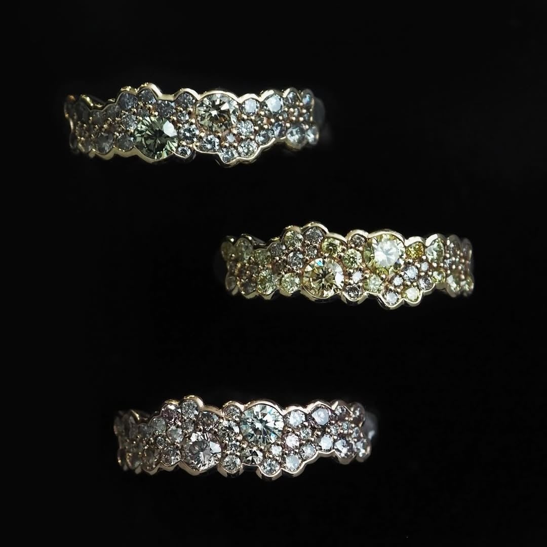 ホワイト、イエロー、シャンパン、ゴールデンなど、幅広い色合いをもつダイヤモンドを繊細にアレンジした、すべて一点もののフォークリングです。デザイナーが長く温めてきた構想をもとに、石の持つ色の広がりと輝きを最大限に引き立てるよう配色しています。