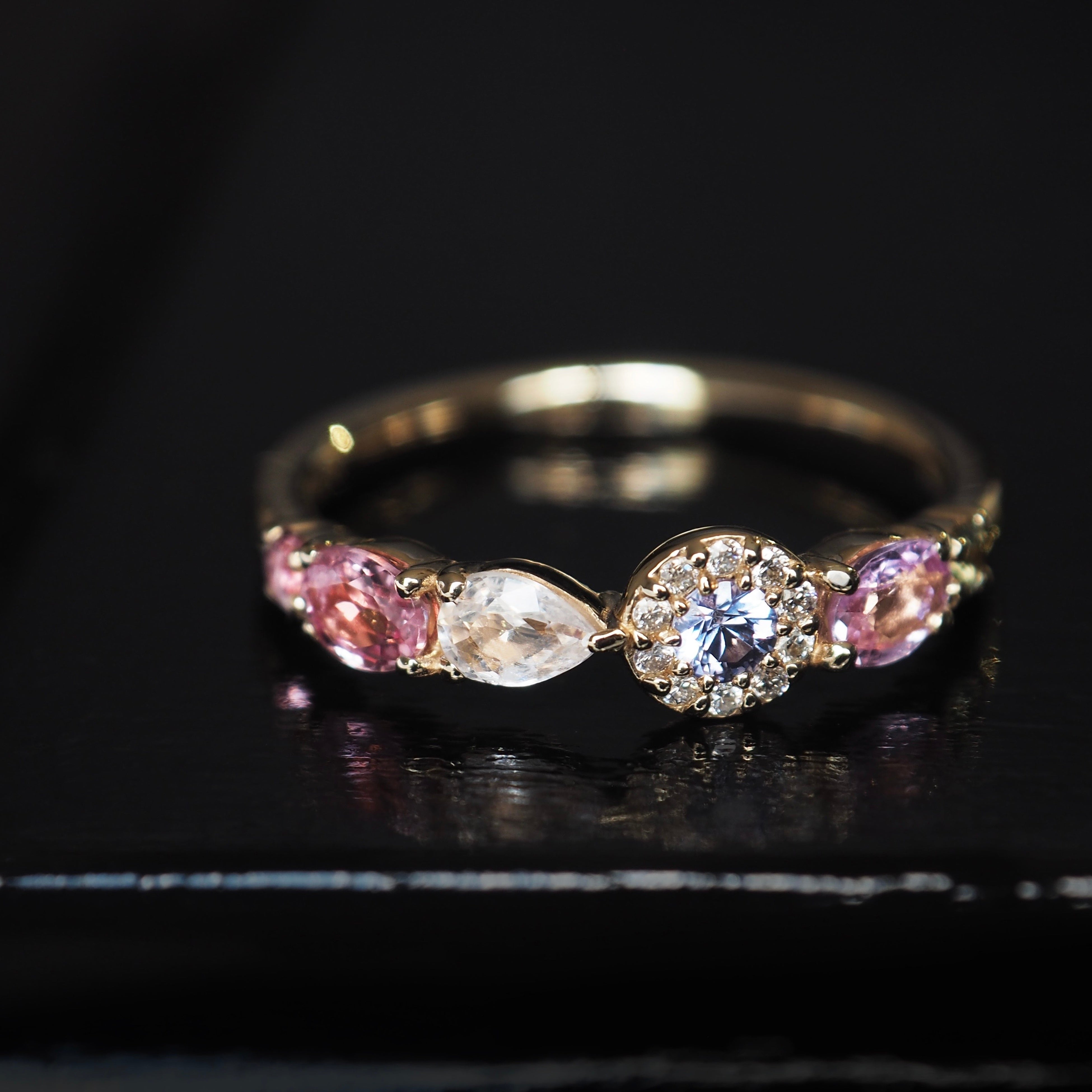 「サンクルール」は、"100の色彩"を意味するシリーズ。さまざまな形や色を持つ宝石を一本のリングに配し、まるで宝石箱のような世界観を表現したコレクションです。