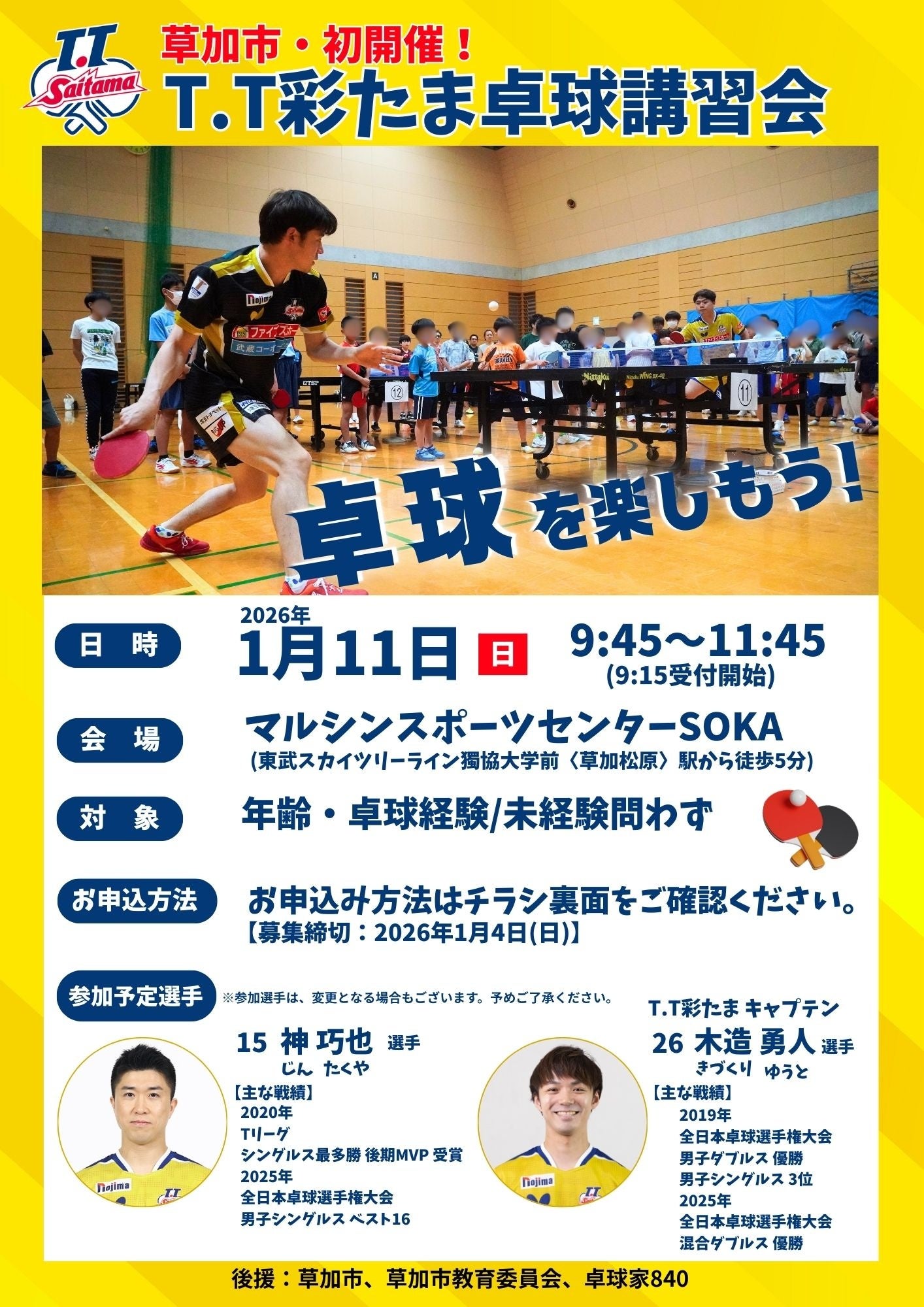 2026年1月11日(日) T.T彩たま卓球講習会 in 草加 開催のお知らせ