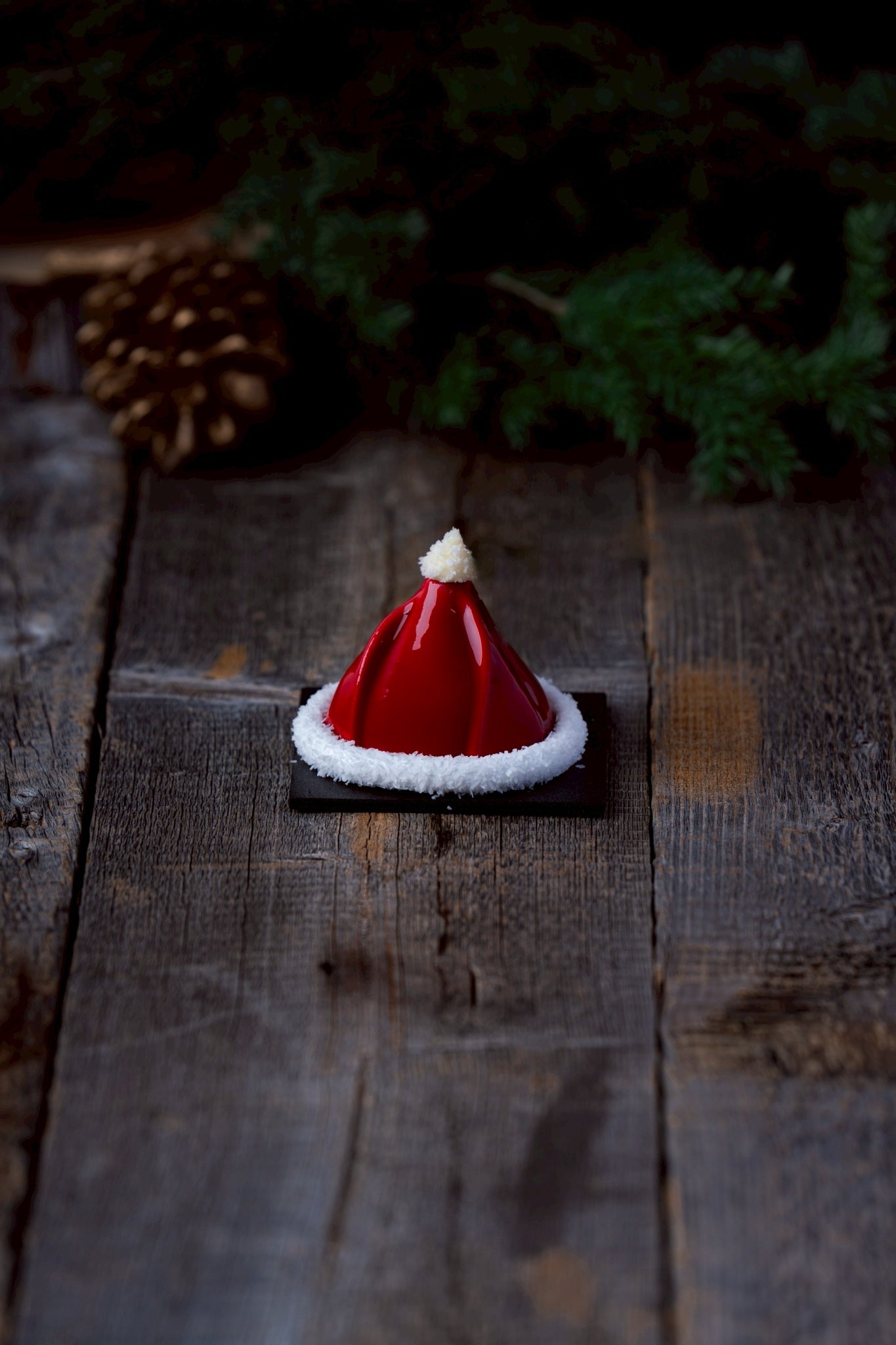 アールグレイ風味のムースの中にイチゴ、ブラックベリー、カシスをミックスしたジュレを入れ、底にはアーモンドのスポンジとクッキ一生地を使用しています。赤色のグラサージュとクリームを絞りサンタの帽子をイメージして仕上げました。