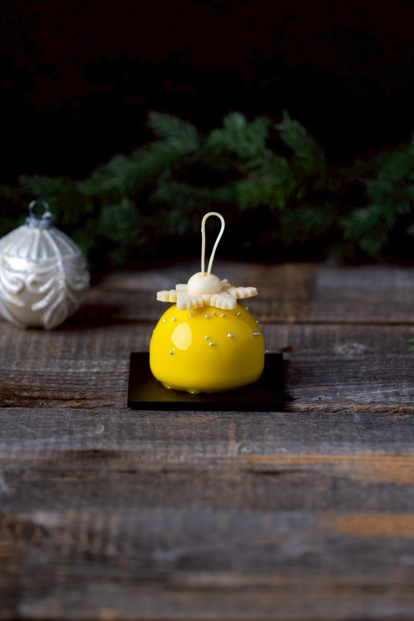 鮮やかなグリーンが目を惹くクリスマスツリーをかたどった可愛らしいプチガトーです。香ばしいピスタチオムースの中には甘酸っぱい苺のコンポテを閉じ込め、華やかでコクのある味わいに仕上げました。