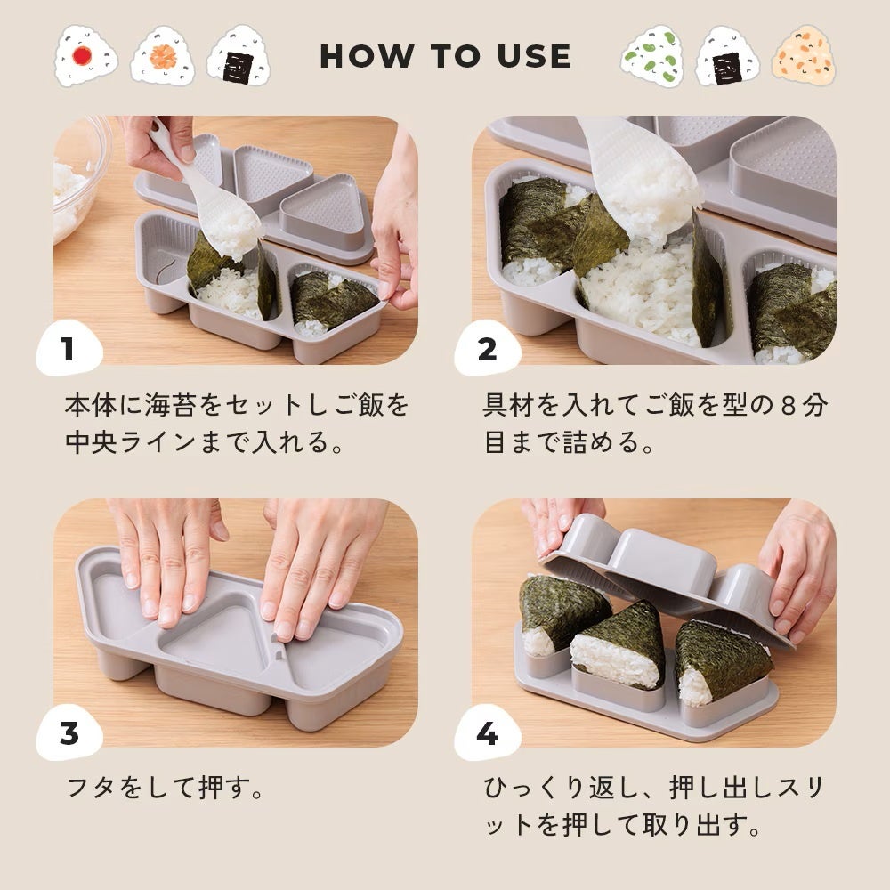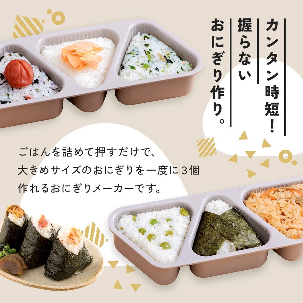 カンタン時短!握らないおにぎり作り。大きめサイズのおにぎりが一度に3個作れて、ミニサイズの専用しゃもじが付いたおにぎりメーカー。「簡単のり巻きおにぎり君」が新登場!