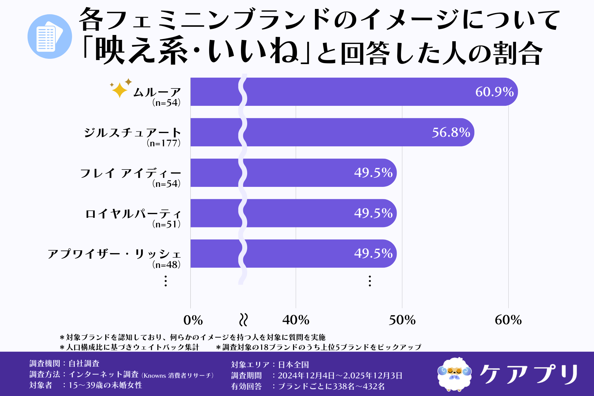 「映え系・いいね」のイメージを持つ人の割合は、『ムルーア』が60.9%で最多となり、『ジルスチュアート』が56.8%で続きました。次いで『ロイヤルパーティ』『フレイ アイディー』『アプワイザー・リッシェ』がいずれも49.5%で並んでいます。